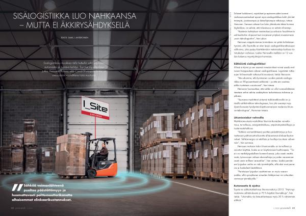 Sisälogistiikkaa muokkaa tällä hetkellä sähköistyminen , automaatio ja kestävä kehitys . Toyotan myyntijohtaja Jukka Heinonen katsoo , että Covid-19-viruspandemia on entisestään vauhdittanut tätä muutosta .