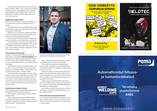 Hitsausrobotit yhä yleisempiä Nykyaikaisiin hitsausautomaatioratkaisuihin erikoistuneen Pemamek Oy : n myyntipäällikkö Samuel Karjalainen kertoo konepajojen hitsausrobotti-investointien lisääntyvän Suomessa koko ajan . Hänen mukaansa robottien tehtäväksi on nyttemmin saatu siirrettyä sellaisia hitsauksia , joita aiemmin hoidettiin manuaalisesti .