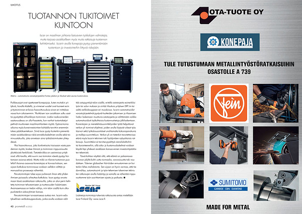 Perustoimintojen turvaamisessa auttaa mm . Iscarin edistyksellinen verkkokauppa-alusta , jonka avulla voidaan välittää ostopyyntöjä talon sisällä , eritellä ostotarpeita esimerkiksi työn tai solun mukaan ja siirtää tilauksia yrityksen ERP : iin tai sieltä verkkokauppaan eri muodoissa . Iscarin automatisoidut varastojärjestelmät pystyvät tuotteiden jakamisen ja tilaamisen lisäksi laskemaan muuttuvia ostotarpeita ja välittämään vaikka automatisoidusti työkohtaisia kustannustietoja jälkilaskentaan . Koneistajien ja menetelmäsuunnittelijoiden työtä helpottavat verkon yli toimivat ohjelmat , joiden avulla löytyvät oikeat työstöarvot sekä työkalusuositukset unohtamatta kokoonpano kuvia ja malleja suunnitteluun . Verkon yli on tietenkin tavoitettavissa etänä myös Iscarin tekninen tuki hyödyntäen nyky aikaisia ratkaisuja . Suunnittelun ei tarvitse pysähtyä vierailukieltoihin tai karanteeneihin , sillä aika- ja kustannuslaskelmat voidaan käydä läpi yhdessä asiakkaan kanssa ennen investointipäätösten tekemistä .