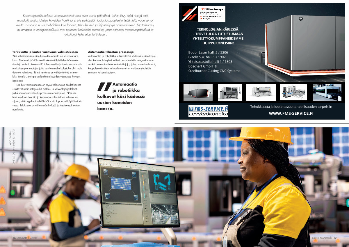 Automaatio tehostaa prosesseja Automaatio ja robotiikka kulkevat käsi kädessä uusien koneiden kanssa. Nykyiset laitteet on suunniteltu integroitumaan osaksi automatisoituja tuotantolinjoja, joissa materiaali virrat, kappaleenkäsittely ja laadunvarmistus voidaan yhdistää samaan kokonaisuuteen.