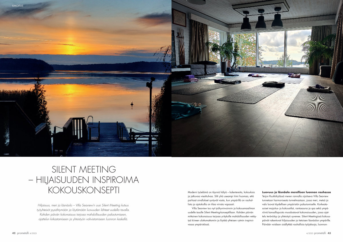 Luovuus ja läsnäolo merellisen luonnon rauhassa Teijon Ruukkikylässä meren rannalla sijaitseva Villa Seaview tunnetaan harmonisesta tunnelmastaan, jossa meri, metsä ja valo luovat täydellisen ympäristön palautumiselle. Korkeatasoiset majoitus- ja kokoustilat, rantasauna ja spa sekä ympäröivä kansallispuisto muodostavat kokonaisuuden, jossa ajattelu terävöityy ja yhteistyö syvenee. Silent Meetingissä kokouspäivät rakentuvat hiljaisuuden ja tietoisen läsnäolon ympärille. Päivään voidaan sisällyttää rauhallisia työjaksoja, luonnon-