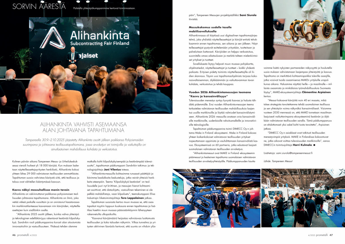 ” Alihankintamessut ovat MAKE in Finland-ekosysteemin päämessut ja keskeinen tapahtuma suomalaisen valmistavan teollisuuden arvoketjuyhteistyölle. Pääkumppanuuden kautta voimme lisätä nykyisten partnereiden näkyvyyttä ja houkutella uusia mukaan vahvistamaan laajempaa yhteistyötä ja kasvua. Tapahtuma on merkittävä kohtaamispaikka tuleville osaajille, jotka voisivat tuoda osaamisensa MAKEn yrityksille urapolkunsa aikana. Haluamme näyttää heille – ja maailmalle – millaista osaamista ja minkälaisia työmahdollisuuksia Suomesta löytyy”, MAKE-ekosysteemijohtaja Clémentine Arpiainen kertoo.
