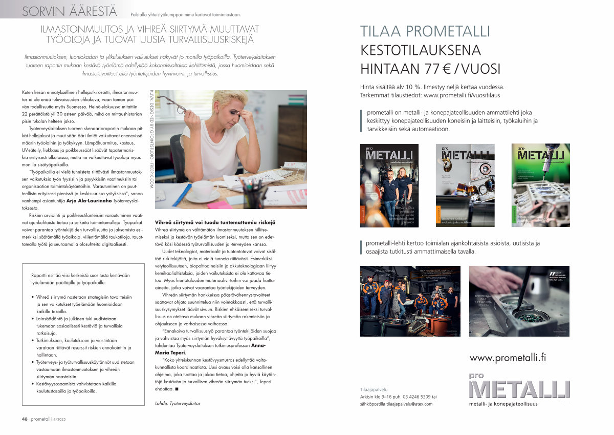 ” Ennakoiva turvallisuustyö parantaa työntekijöiden suojaa ja vahvistaa myös siirtymän hyväksyttävyyttä työpaikoilla”, tähdentää Työterveyslaitoksen tutkimusprofessori Anna- Maria Teperi.